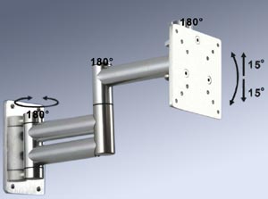 Diese elegante und edle Befestigung für Flachbildschirme liefert Qualität im Detail und kann durch gezieltes Schwenken auf den Betrachter an fast jede Stelle des Raumes ausgerichtet werden. Die Stabilität dieser Massiv-Aluminium-Halterung ist aber auch optisch eine sehr schöne Lösung für den qualtitätsbewußten Kunden für Bildschirme von 10" bis 23". Hochwertig, funktionell und moderat im Preis!